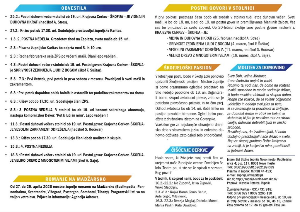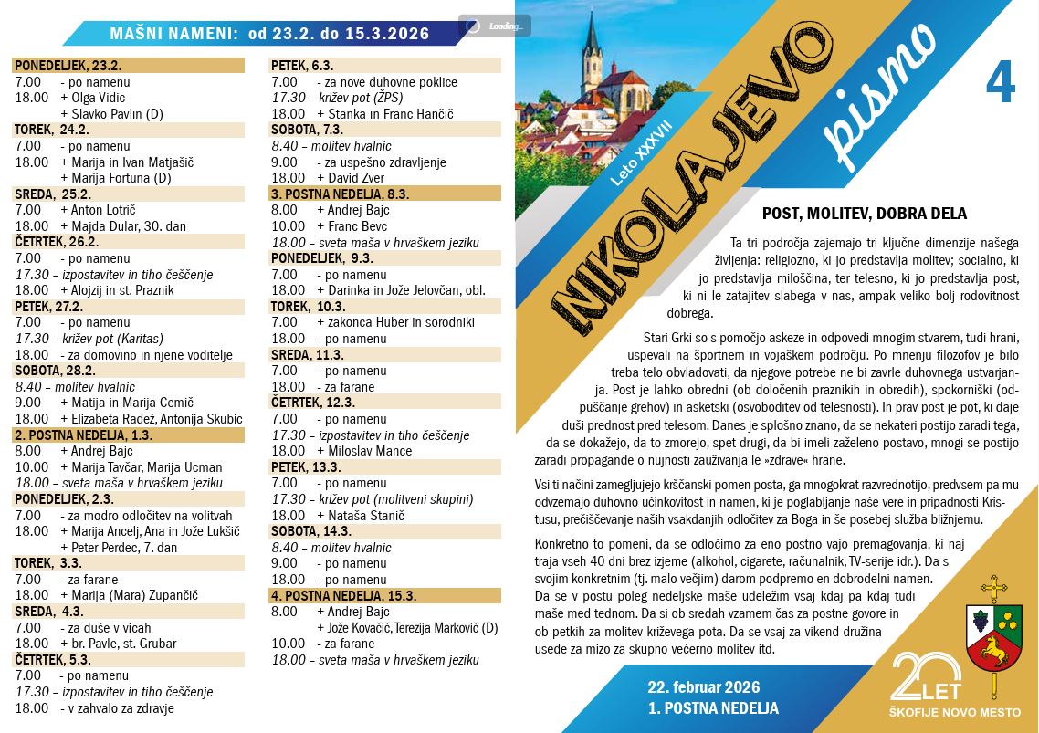 Ob izhodu si vzemite novo številko Nikolajevega pisma. V tej številki si že lahko preberete, kdaj bodo letos postni govori v stolnici in kdo jih bo imel, da si boste pravočasno rezervirali čas in se jih udeležili.