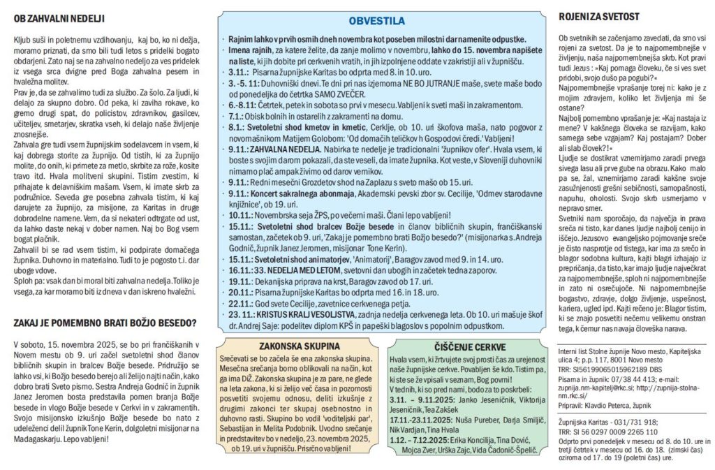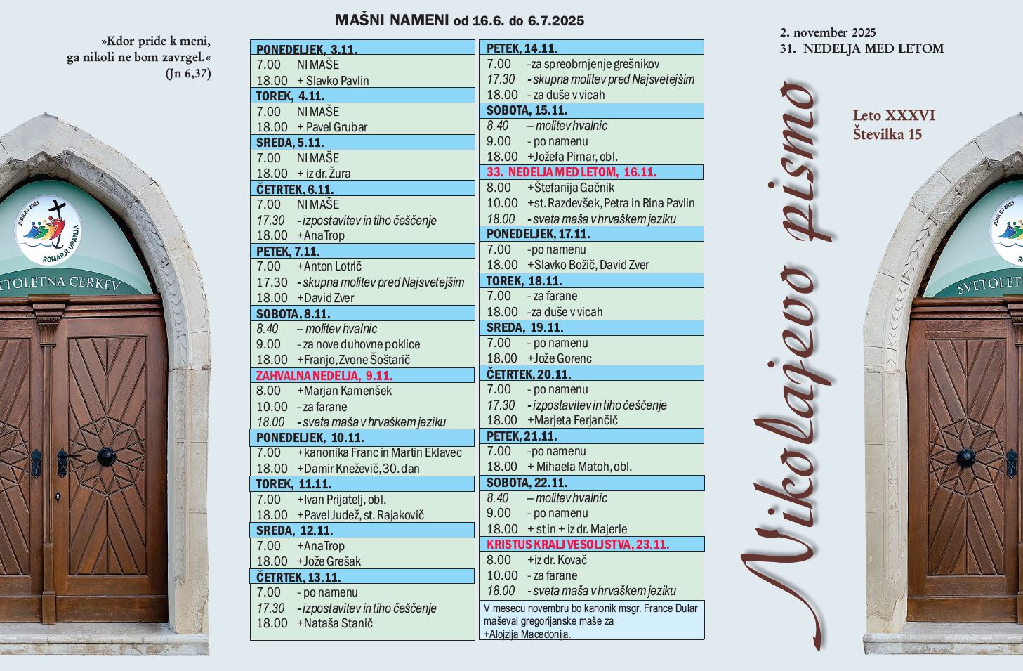 Ob izhodu si vzemite novo številko Nikolajevega pisma, ki prinaša razpored svetih maš in obvestila za naslednje tri tedne.