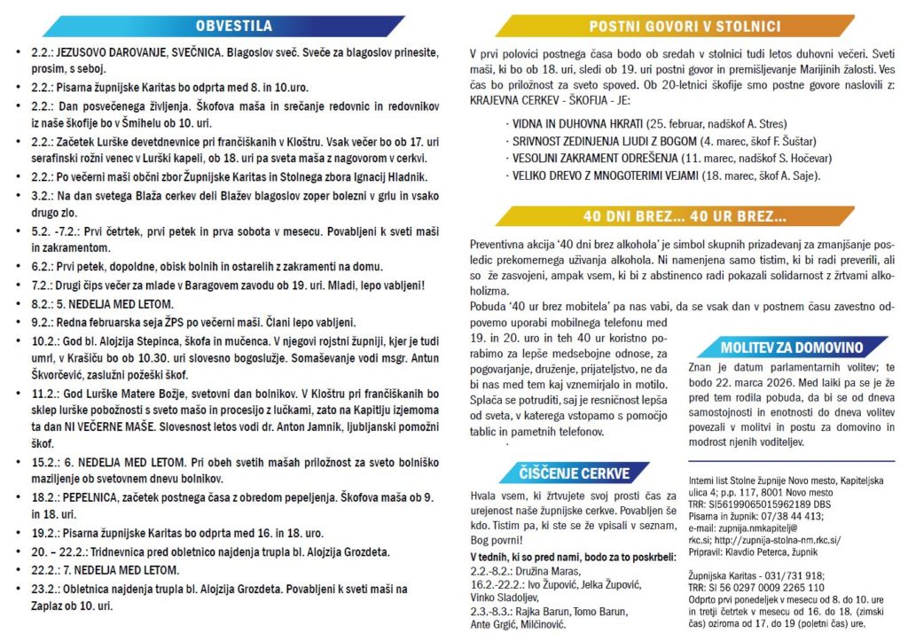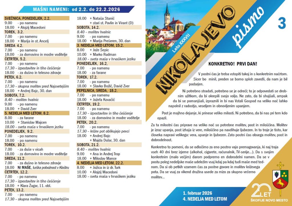 Ob izhodu si vzemite novo številko Nikolajevega pisma. V tej številki si že lahko preberete, kdaj bodo letos postni govori v stolnici in kdo jih bo imel, da si boste pravočasno rezervirali čas in se jih udeležili.