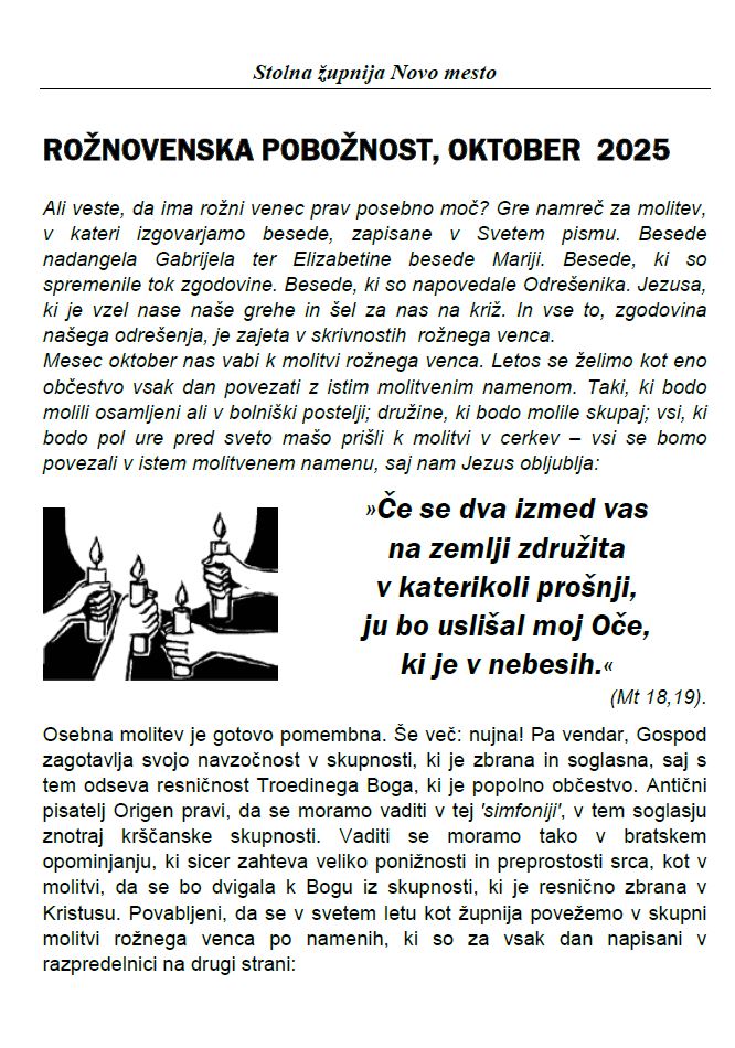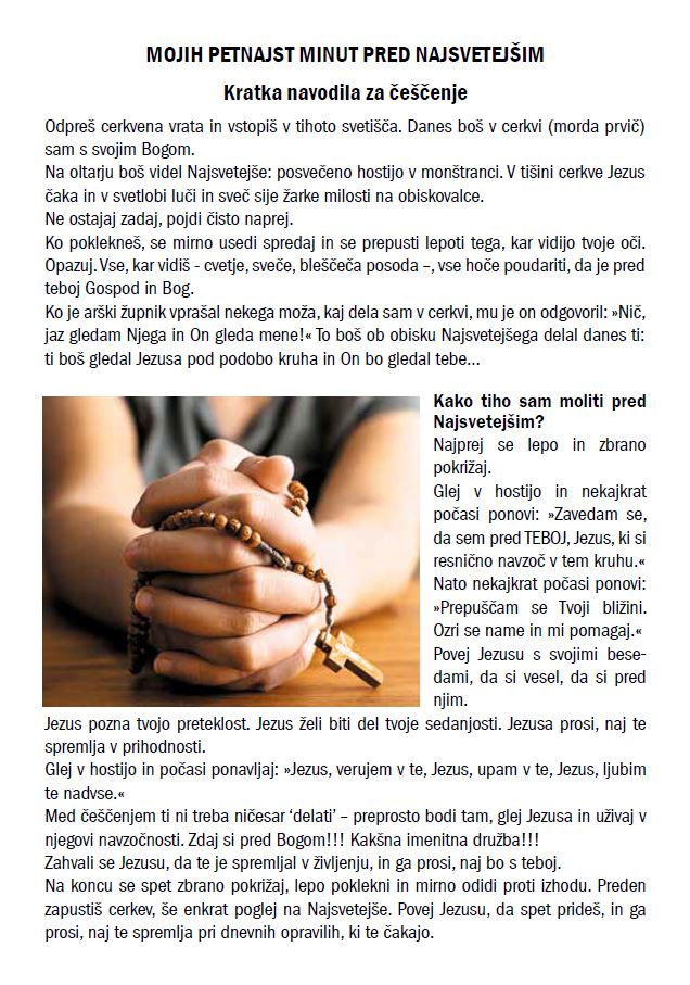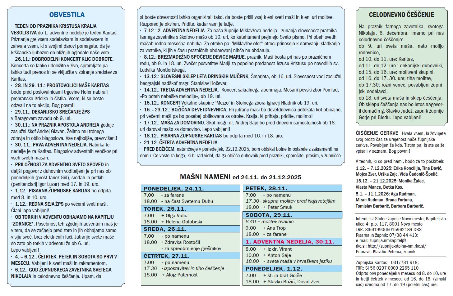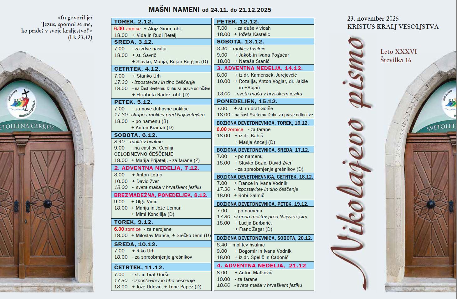 On izhodu si vzemite novo številko Nikolajevega pisma, ki prinaša razpored svetih maš, koristna obvestila in dve prilogi: povzetek poročila naše župnijske Karitas in kratka navodila za češčenje Svetega Rešnjega telesa pred celodnevnim češčenjem v naši župniji.
