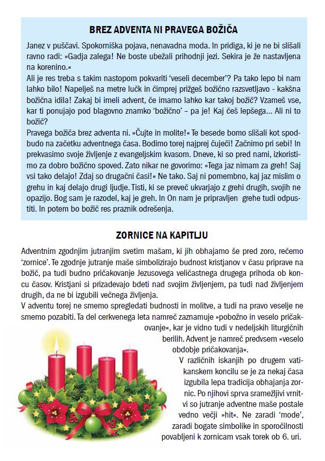 Danes teden bo PRVA ADVENTNA NEDELJA. Blagoslov adventnih venčkov bo pri vseh svetih mašah, zato jih ne pozabite prinesti s seboj. Vsaka blagoslovljena stvar prinaša v naš dom Božjo bližino in Božje varstvo. Adventni venčki naj zato ne bodo samo dekoracija ampak povabilo k skupni družinski molitvi. Nabirka 1. adventne nedelje je vedno za Karitas.